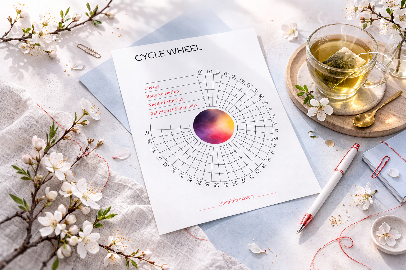 I created this wheel by combining what I appreciate in traditional cycle tracking with a deeper focus on emotional literacy. It invites you to slow down, stay curious, and gently observe your changing energy, body, needs, and relational sensitivity — without overthinking.